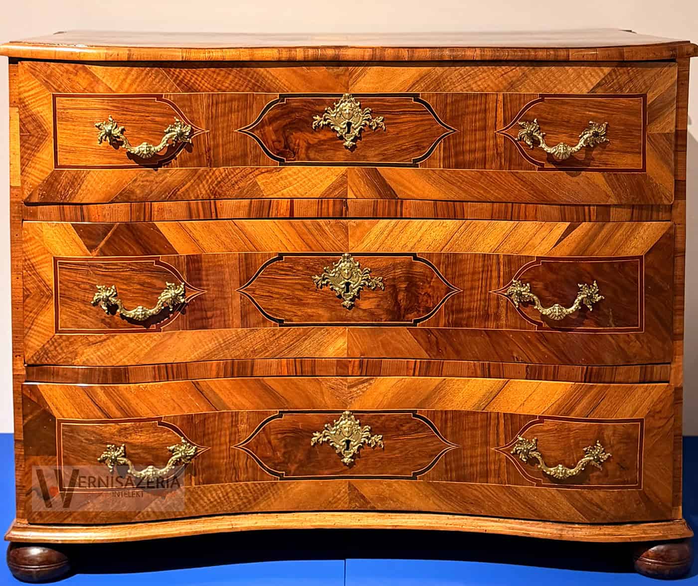 I tak oto powstawały przepiękne, kunsztowne meble fornirowane, zdobione intarsją, czyli techniką polegającą na zdobieniu drewnianych powierzchni cienkimi fragmentami innych gatunków drewna, przy czym wzory się nie powtarzały.